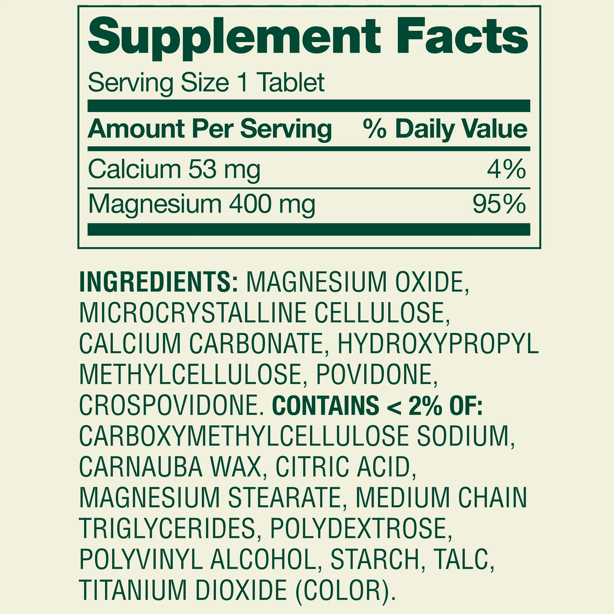 - Extra strength formula: 400 mg of magnesium per tablet